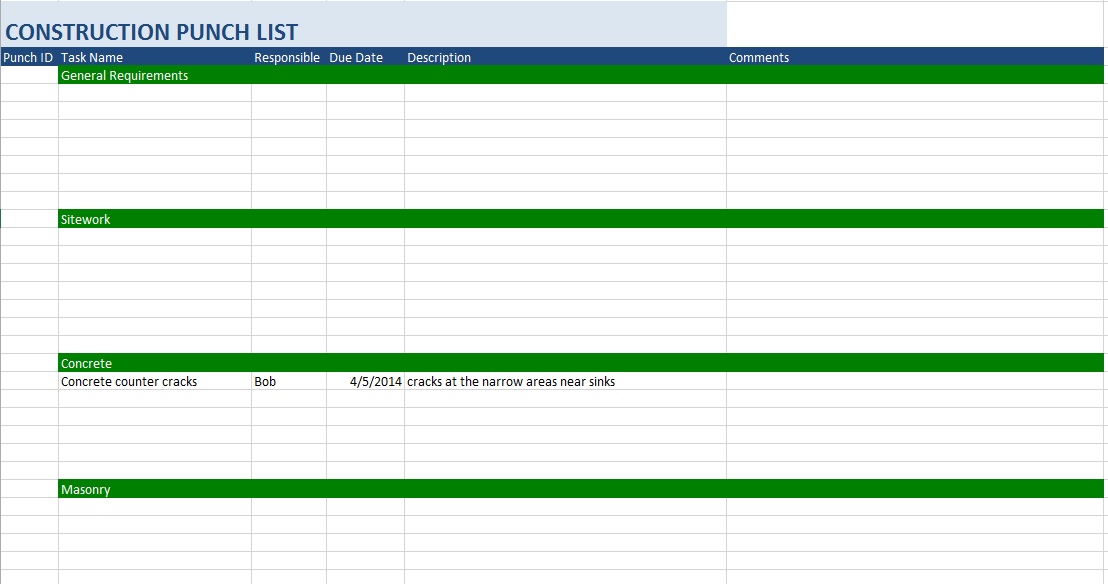 A Construction Punch List is a document to prepare at the end of a construction project.